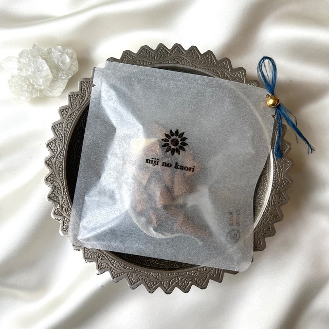 niji no kaori お香【N°4 密教 Secret】 1袋5個入り 〈キーワード〉 儀式 神聖 松果体 秘伝 モーセ エジプト 〈使用素材〉 ハーブ:ホワイトセージ アガーウッド フランキンセンスなど 精油:ブルーロータス スタイラック ガルバナムなど その他:自家製フランキンセンス芳香蒸留水 金箔 ヒマラヤクリスタル 麻炭 塩 パッケージには 「インセンスのエネルギーが守られますように」 という願いを込めて 藍染めの精麻と鈴を添えています *…*…*…*…*…*…*…*…*…*…* niji no kaoriのお香は 古来神聖なハーブとされている ホワイトセージや麻などの植物を中心に ときには鉱物や植物錬金エッセンスなどの こだわりの原材料を調合して 一つひとつ手作りしています お香の煙は 見える世界と 見えない世界の橋渡し 儀式を執り行う際に 日々の内観に 祈りに niji no kaoriのお香が お役に立ちますように 〈使い方〉 お香の円錐型の先端に火を点けて香皿の上に置き、 香りを楽しみます。 燃焼時間は約12分です。 火の取り扱いや火災報知器には十分にご注意ください。
